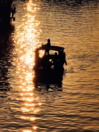 和家人一起去的朱家角,恰逢很美的落日余晖。 远处是渐暗的蓝紫色天空,金色的夕阳洒在水面上波光粼粼,时不时从远处划来一艘艘的摇橹小船,晃晃悠悠的从远处慢慢靠近再远离。我拿起手机提前站在选好的位置,静静的等待船只移动到我想要的位置时,拍下了这张剪影。