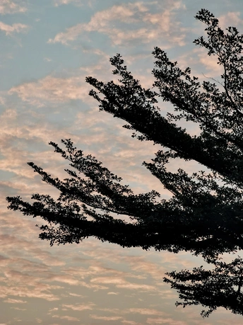 清晨,霞光耀彩,染红了云朵,天空彩云飘飞。眼前一棵小叶榄仁枝叶繁茂,挡住了视线,形成剪影。