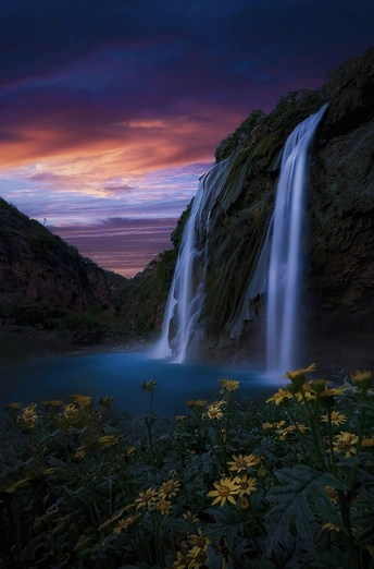 瀑布前开着一团茂盛的小黄花,使用超广角可以一并记录下来,花朵作为前景,湖面瀑布为中景,远山和云霞为远景.并使用较慢的快门让瀑布和湖水丝滑柔美.可以让整个画面晓得非常漂亮.