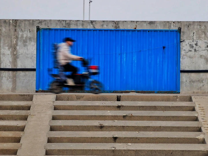 在东海岸堤坝上,一位骑电动车的人快速骑行通过一个蓝色车厢。