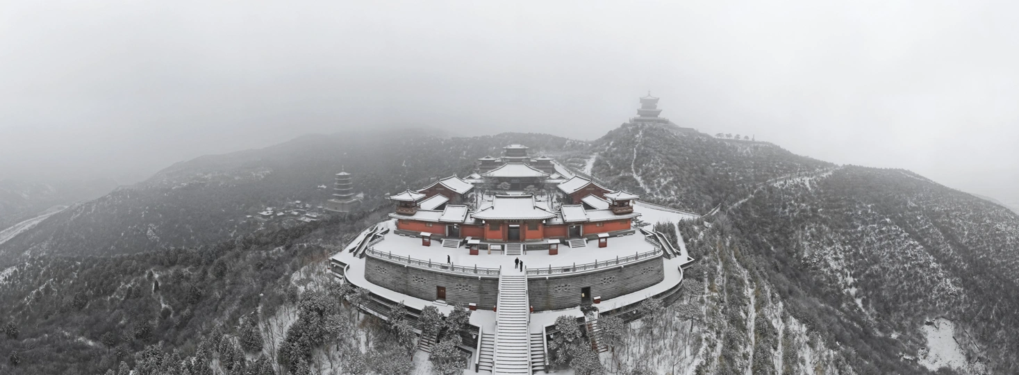 2022年1月22日,刚下过头场雪的太山,在一片白茫茫中,红色的龙泉寺傲立山巅。