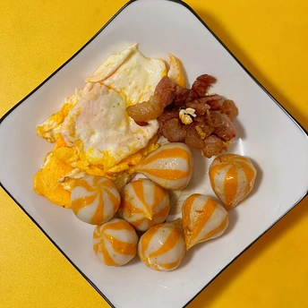 打工人还在打工 想吃个鸡蛋 居然是坏的 于是重新开了两个鸡蛋 没放盐 喜欢粘着甜辣酱吃 买了喜欢吃的丸子 加上一点肉肉 吃饱饱 明天的年夜饭会是什么样的呢