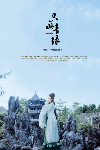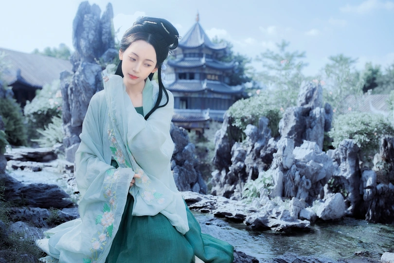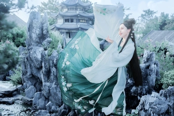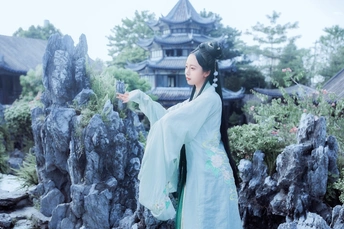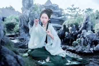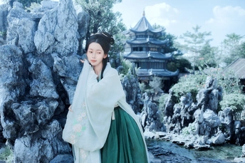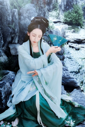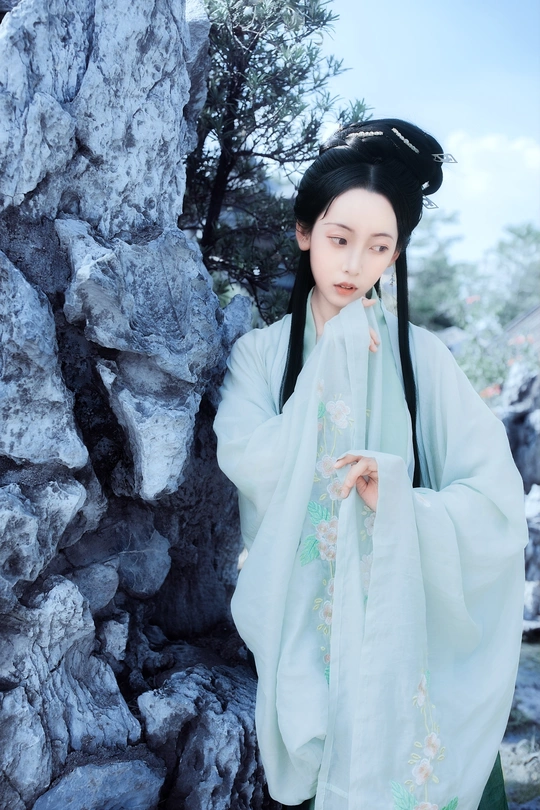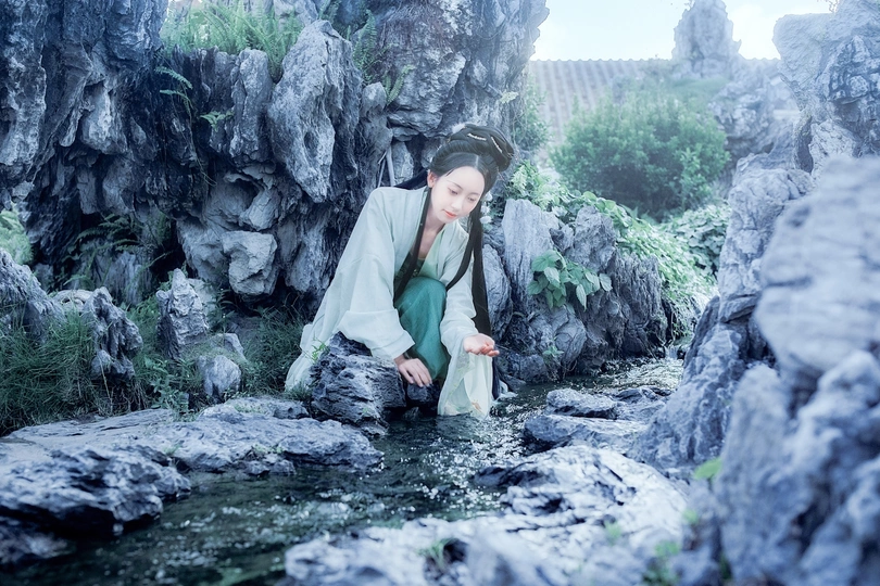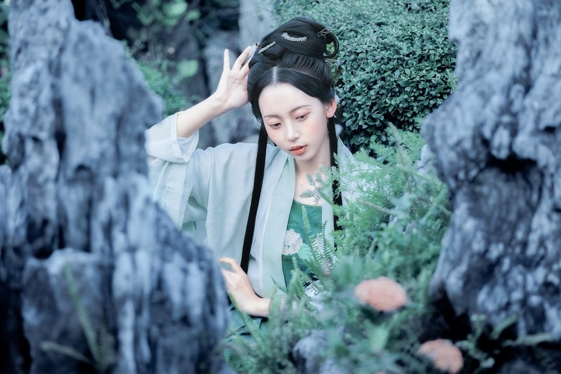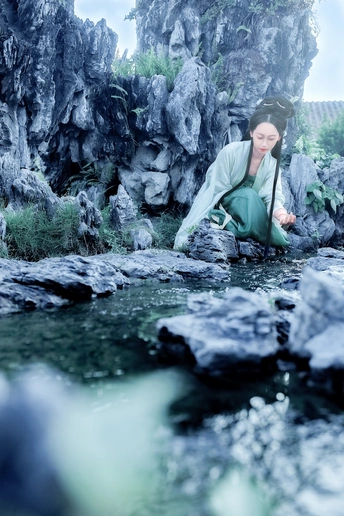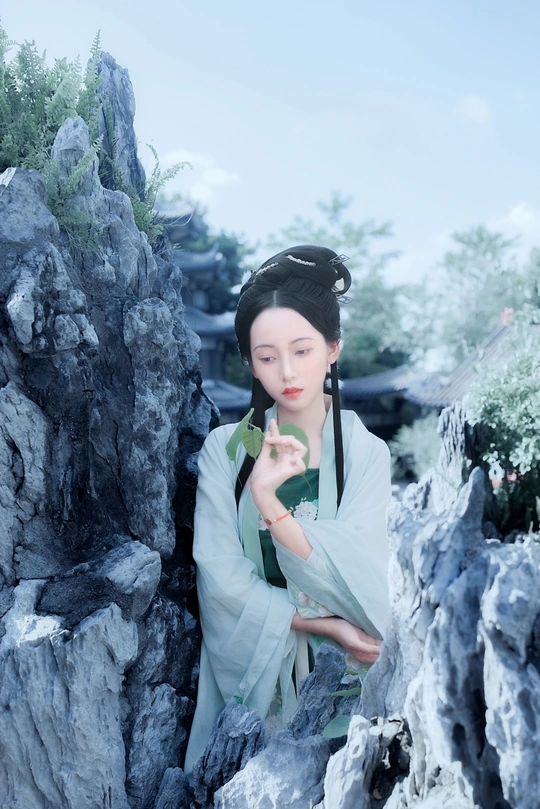 青绿色汉服美女融入江山图假山中,另有一番风味: ---千里江山,只此青绿