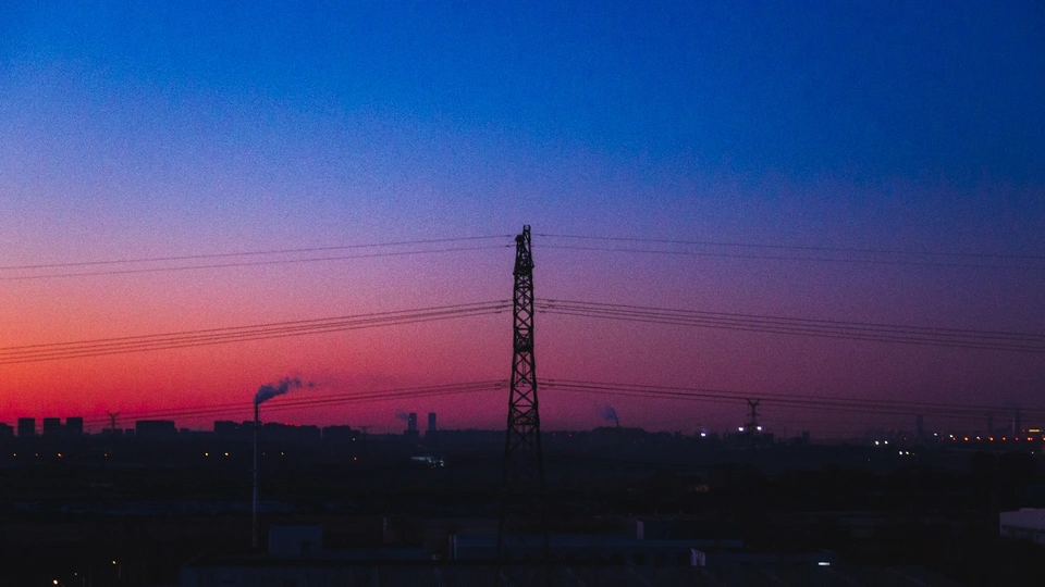 日出前的时候,天空还是蓝红的渐变色彩,这个电线杆和周围的线贯穿了整个天空,形成了一种强烈的对比。
