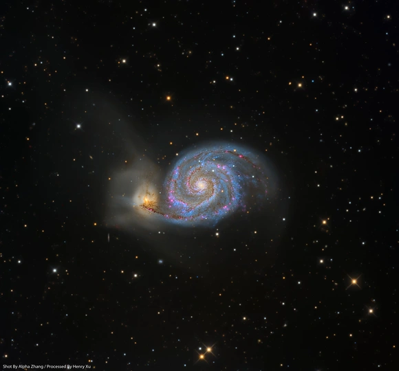 涡状星系是编号为M 51或NGC 5194的星系,距离我们2300万光年。正如它的名字所暗示的那样,涡状星系是一个典型的旋涡星系。天文学家认为我们的银河系的形状是与它相似的。在旋涡星系的明亮旋臂中,有大量年轻而质量巨大的恒星,它们无所顾忌地挥霍着自己的燃料。这也是为什么它们围绕星系中心走不了多远便要暗淡下来的原因。这些暗淡下来的恒星拥挤在旋臂之间的位置。巨大的涡状星系身旁还有一个小星系。那个小星系是NGC 5195。照片显示两个星系正在向一起碰撞。但实际上,新的研究表明小个头的NGC 5195已经从涡状星系身后闪过,它们正在相互远离。 拍摄者:Alpha Zhang 后期:我