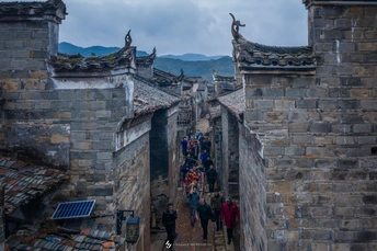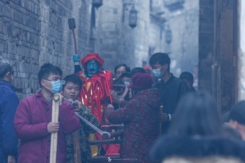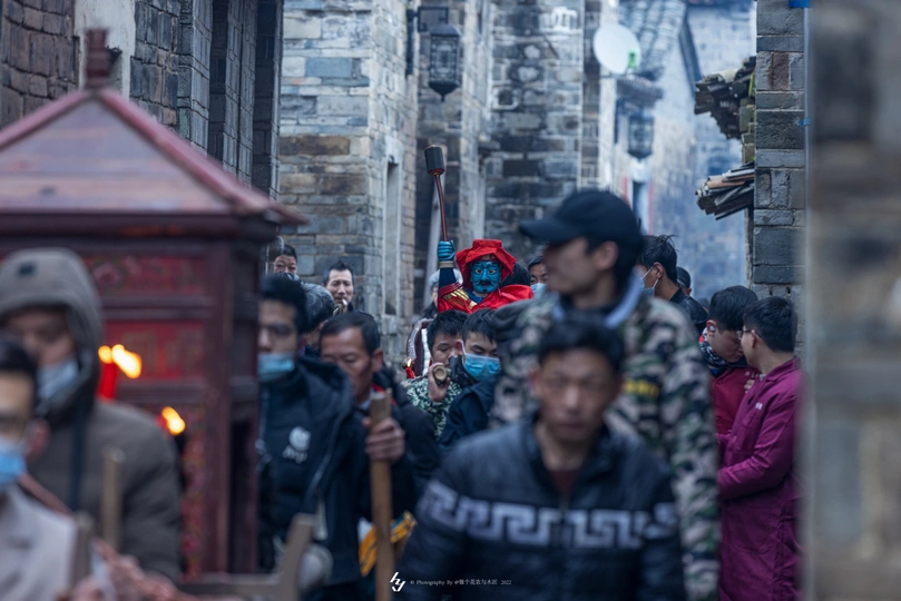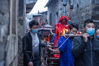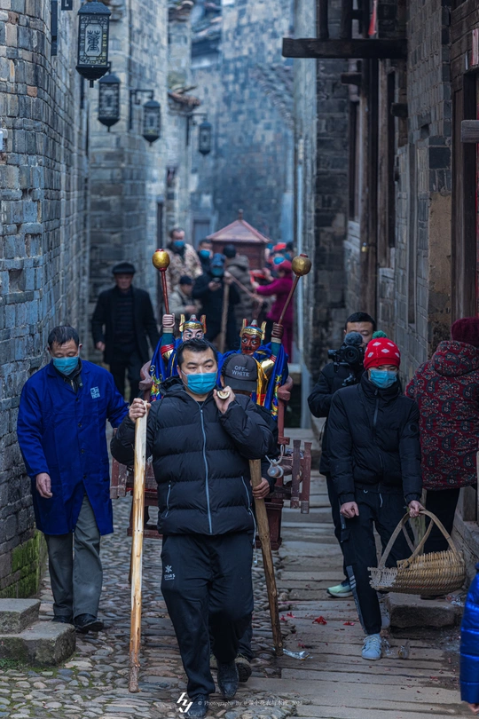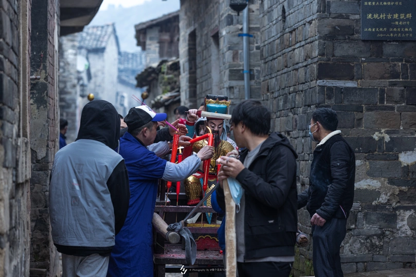 在江西抚州市乐安县流坑村,每年正月会在村落中举办游老爷民俗活动,一队人马抬着老爷像在村落中的每个巷道行走,每一个老爷像经过每一户人家都会进行停留,给村民烧香祭拜