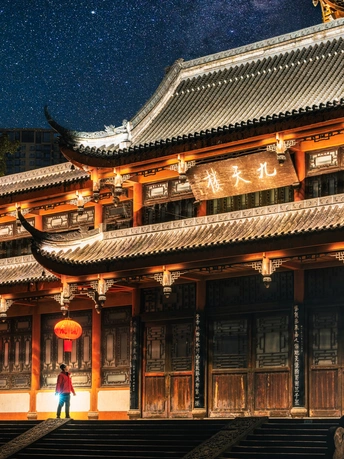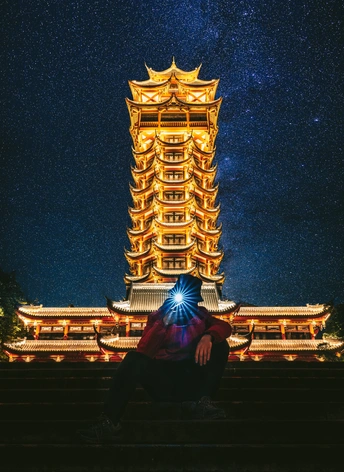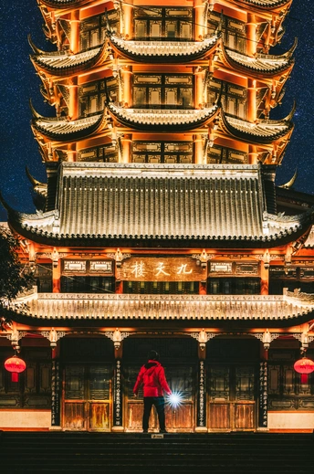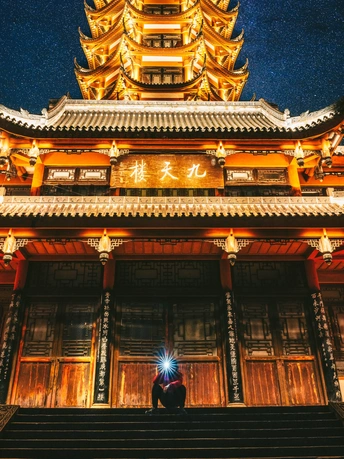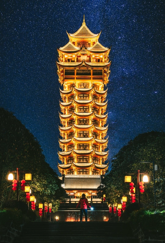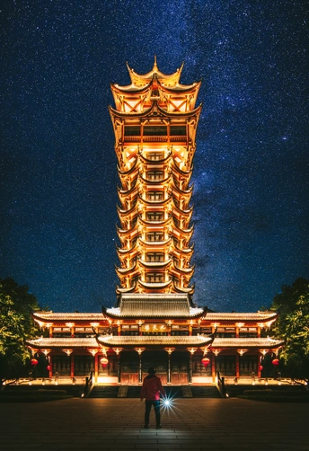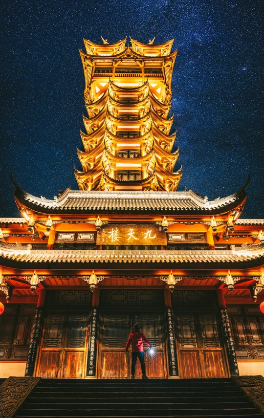 “锦绣天府第一楼”——九天楼巍然坐落于成都市塔子山园内浅丘顶部,原名散花楼,始建于隋末,为蜀王杨秀所建。 1995年,九天楼重修工程破土开工,1997年落成,其名取自诗仙李白名诗《登锦城散花楼》中“今来一登望,如上九天游”。该楼高达70米,共13层,总建筑面积4千余平方米。3-10层为八面形塔状结构,飞檐翘向天穹,11-12层由4个小方亭组合而成,顶层以一个大方亭收顶。 该塔楼设计精巧,结构独特,运用现代建筑技术施工,钢筋混凝土框架仿木结构,融楼塔亭台为一体,古代建筑艺术和现代民间建筑艺术巧妙结合,建筑风格突出了地方特色,远看似塔,近看似楼,造型新颖独特,享有“塔山揽秀”的美誉。