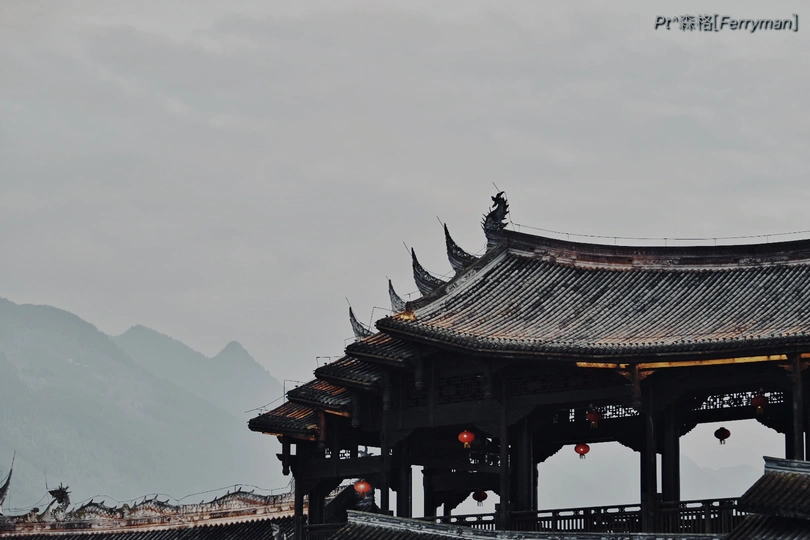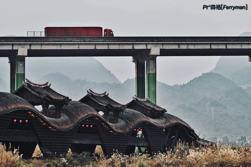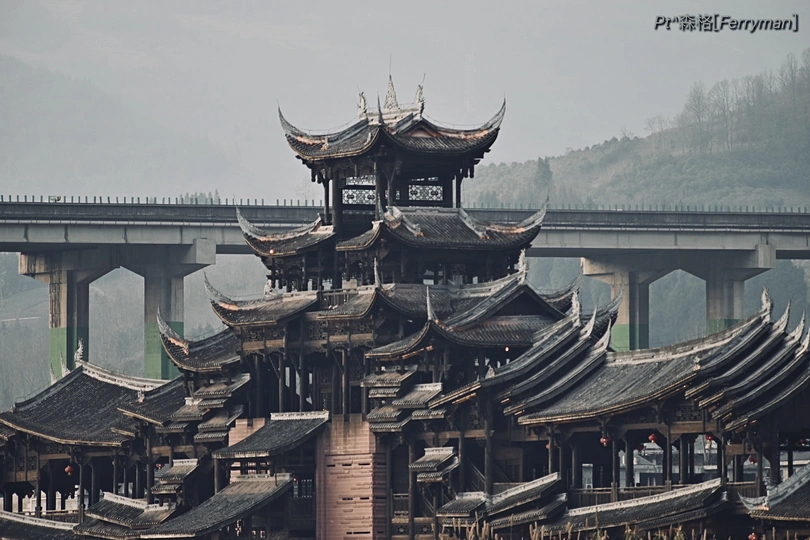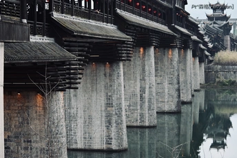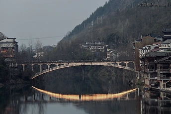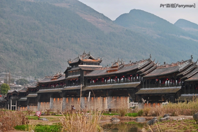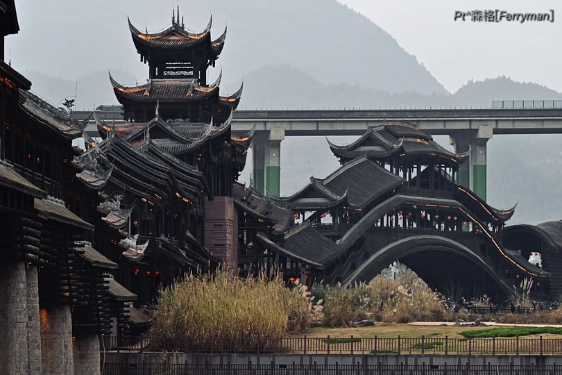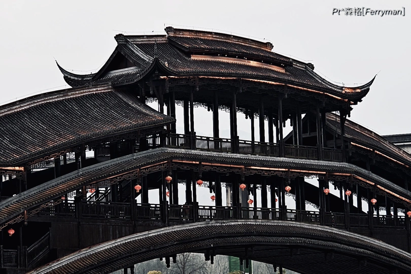 风雨廊桥横跨于阿蓬江上,长303米、宽5米,分为桥、塔、亭三部分,桥身为纯木制结构,建筑材料之间以榫头卯眼互相穿插衔接,直套斜穿,结构牢固精密,桥上建有层塔亭,桥内摆放有红漆长凳。