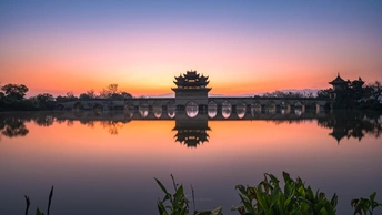 云南建水双龙桥,这是座三阁十七孔大石拱桥,坐落于云南建水古城西,横跨泸江与塌冲河交汇之水面,是云南著名古迹之一,已列入中国造桥史册。清乾隆年间先建三孔,道光年间又建十四孔与之相连,因此俗称 “十七孔桥”。