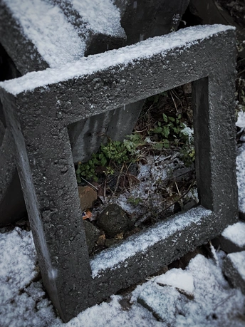 水泥石框下,杂草如一幅画。