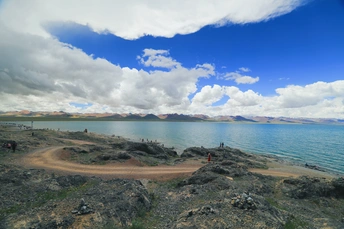 纳木错湖,又称腾格里海、腾格里湖。蒙语腾格里,意为“天”,这是因为湖水湛蓝明净如无云的蓝天,所以名之。它位于西藏拉萨市以北当雄、班戈两县之间。湖南是雄伟壮丽的念青唐古拉山,北侧和西北侧是起伏和缓的藏北高原。湖开狭长,东西长70公里,南北宽30公里,面积为1940平方公里。纳木错的湖水来源主要是天然降水和高山融冰化雪补给,湖水不能外流,是西藏第一大内陆湖。湖区降水衡少,日照强烈、水分蒸发较大。湖水苦咸,不能饮用,是我国仅次于青海湖的第二大咸水湖。纳木错湖四周雪峰好像凝固的银涛,倒映于湖中,肃穆、庄严,极自然之致。湖中有3个岛屿,东南面是由石灰岩构成的半岛,发育成岩溶地形,有石柱、天生桥、溶洞等,景色美丽多姿。