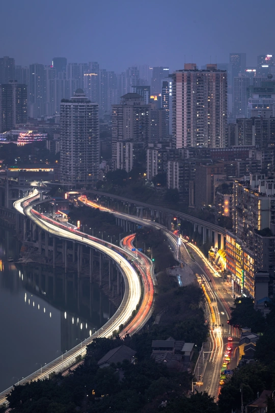 在鹅岭公园眺望李子坝和牛角沱,白天里热闹非凡的李子坝网红打卡地已经褪去了所有繁华,重新回归本质,安静地承载着归家的人们。而白天不显痕迹的临江大道,却在夜晚绽放了夺目的光彩!