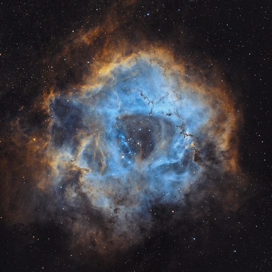 玫瑰/蔷薇星云(NGC 2237),是一个巨大的电离氢区,位于麒麟座一个庞大分子云的末端。这个分子云集团包括NGC 2237、NGC 2238、NGC 2239、NGC 2244、NGC 2246五个NGC天体。 四张拼接 累计25h ASA半米镜+FLI 16803 CCD 拍摄于智利天文台