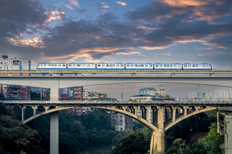 重庆,作为桥梁之都,就算是轨道交通也不免如同桥梁般横跨河流,连通两岸。 照片摄于重庆巴南,由于地势原因,这一段轨道落差大,导致图中的轨道交通列车如同在天空穿梭,现代化的轨道桥梁和下方的古旧石桥形成了鲜明的对比。