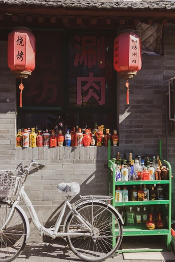 这是一家胡同里的涮肉 烧烤店老板在窗台上摆放了好多好多酒瓶,突然感觉很有意思。这家店的生意应该很好。