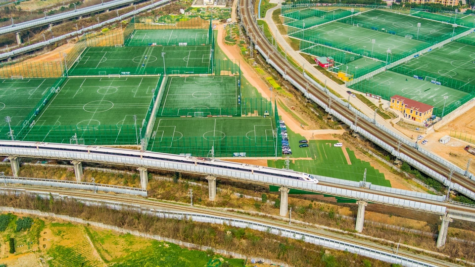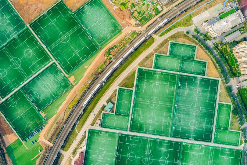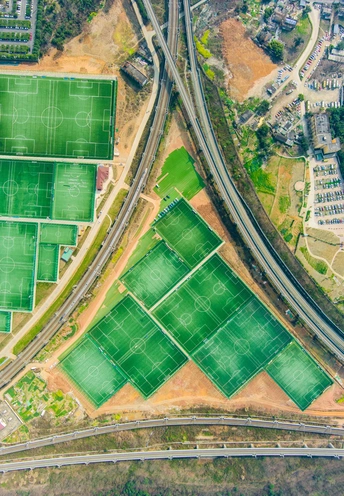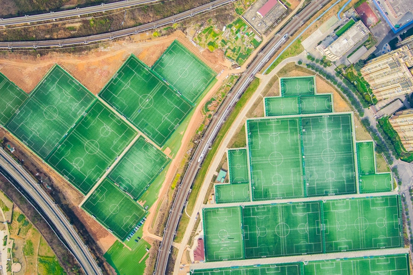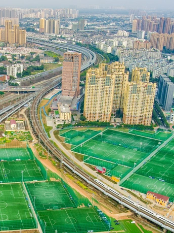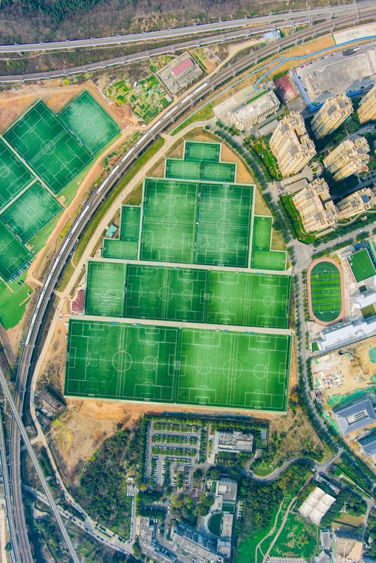 “新仁德足球公园”属于锦江体育公园的一部分。从高处俯瞰,的确已经有大大小小十几块球场已经呈现了,有5人制、8人制、11人制足球场,看着着实有点壮观!一般10块足球场连片的已经很少了,二十多块连片几乎没有。而且是一个高铁穿越的体育公园,再全国更没有。