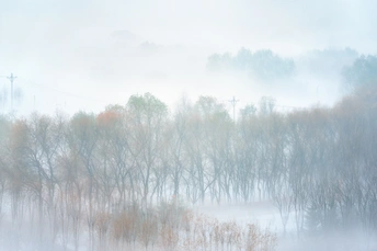 雨后的城市被晨雾笼罩,隐约的远处的山林如水墨装点在宣纸上,远处留白的天空更似中国水墨风!
