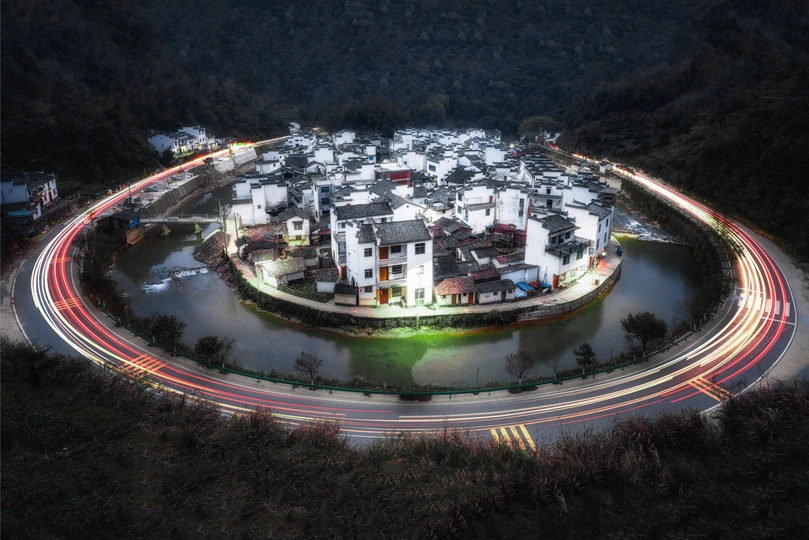 中国最圆的村庄——菊经村。三面临水,一面靠山,“后山前水”的设计被誉为“最远的村庄”,当地人称它为“脸盆村”。
