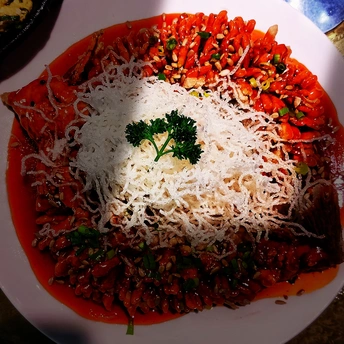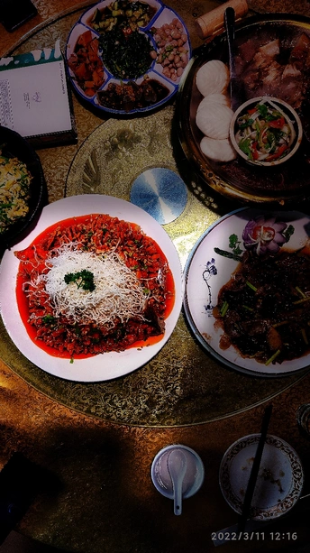 那盘松鼠鱼 造型简约却华丽 红的似火 白的如雪 峰顶翠绿点缀 默默的 向人们诉说着自己的独特 看着那色香味俱全的精品佳肴 让吃货们食欲大增 摄地:邢台健康主题餐厅 拍机:小米9透明版