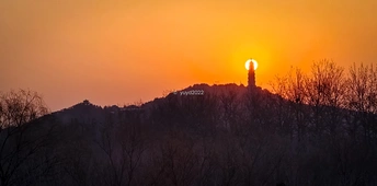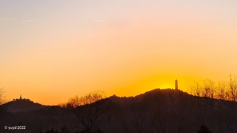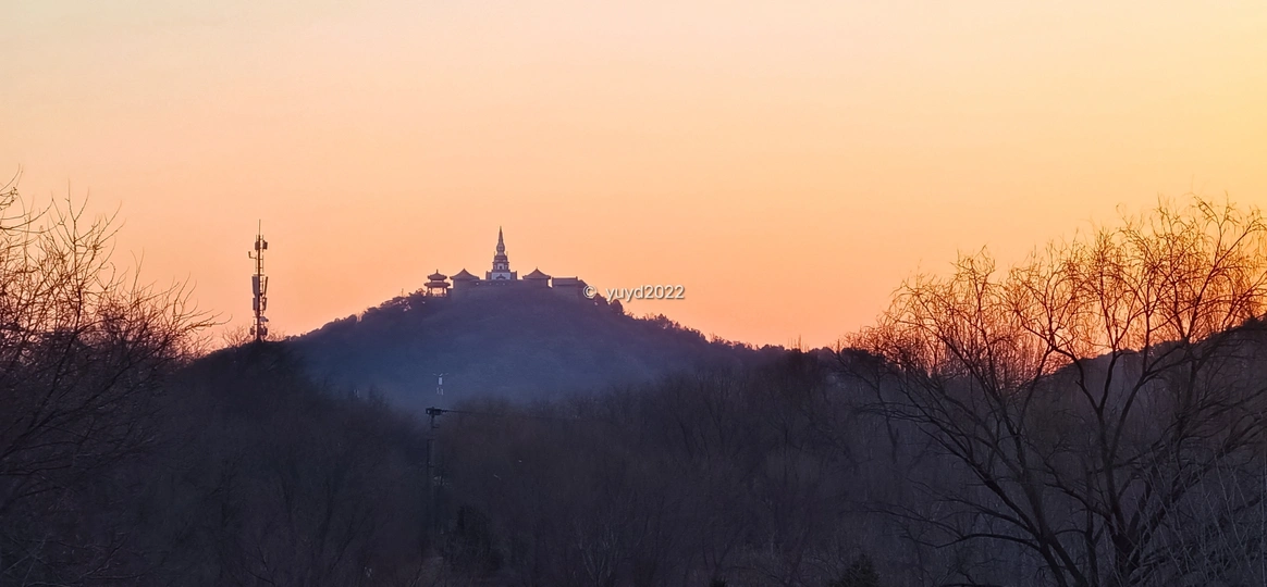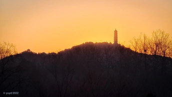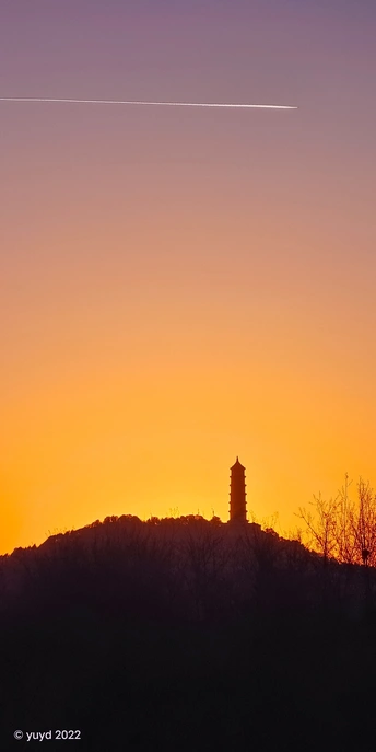 日出前的金色霞光,映照着玉峰塔的剪影!