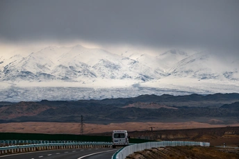 在国道上驶向雪山