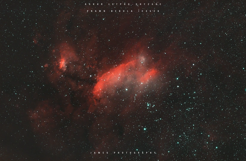 斑节虾星云 Prawn Nebula 天体编号:IC4628,或称为斑节虾星云(Prawn Nebula),是位于天蝎座的一个发射星云,距离地球约6000光年。 由天文学家让·玛琏·爱德华·史提芬于1829年11月16日发现。 IC 4628是年龄只有数百万年的年轻星云。 该星云被天蝎座OB1星协内大质量恒星照亮,并且该区域内的氢受到恒星辐射的紫外线照射而电离。 天文相机:QHY268C 赤道仪:信达 HEQ5 PRO 望远镜:锐星 ASKAR 107PHQ 导星相机:QHY462C 导星镜: 锐星 ASKAR FMA180 电动调焦:ZWO EAF 控制盒:Stellarmate OS + QHY Star Master Pro 窄带滤镜:Optolong L-Enhance 2英寸 累计天体曝光时间:15x600秒 环境温度15度 拍摄温度 -10度 Gain 0 Offset 50 Pixlnsight 1.8.8-12处理 ,Topaz DeNoise AI 降噪 Photoshop 最终调整 拍摄心得: 斑节虾凌晨才从地平线上升起,使用调度器设置为第三个拍摄目标,前两个依旧是船底座和蜘蛛星云,完全依赖 Kstars 的星图模拟构图,预设所有的对焦,导星和抖动,一直拍到晨光时分,所以我计划是20张,实际拍摄了15张。 赤道仪自动归位,冷冻相机关闭降温,EKOS 和 indi 自动关闭,除了没能自己盖上镜头盖,基本实现了全自动拍摄和关闭