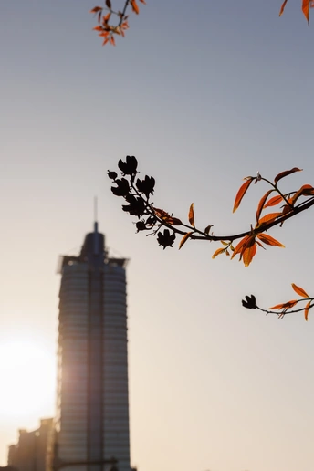 在夕阳下城市的楼群中,紫薇树发出了新芽,城市也充满春意