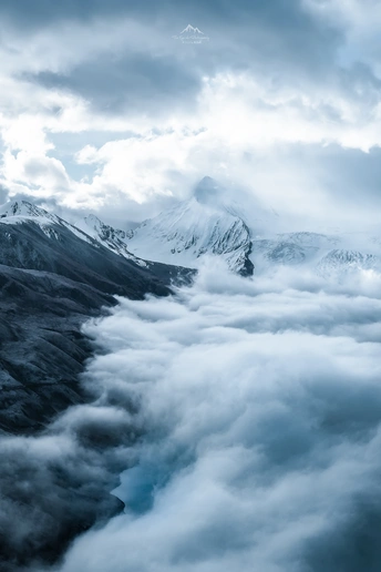 在萨普的第三天,幸运地遇上云海,清晨走出牧民家的时候,完全身处云雾之中。看不见萨普群峰,看不见圣湖,甚至连近处的木桥溪流都消失不见。只有当无人机飞上500米高空,才能看见云雾如海浪般弥漫在群峰之间。我喜欢的雪漠峰(被称为萨普的妻子)在一两个小时后才似睡非醒地露出了山峰。 2021.10.4摄于西藏萨普