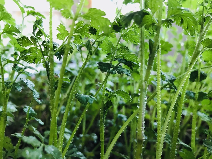 去年种的香菜,准备吃的时候没有连根拔起,而是从根部两厘米处开始剪掉,保留根部以便继续生长,上一茬在冬天就吃完了,等着,等着,可算又钻出新的一批,又长了这么高~