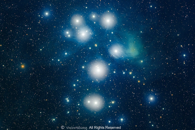昴星团(Pleiades),梅西叶星表编号为 M45,位于金牛座天区明亮的疏散星团,构成星团几个亮星在昴宿,由此得名。人类在北半球晴朗的夜空用肉眼就可以看到它,通常见到有六七颗亮星,所以又常被称为七姊妹星团、七姐妹星团。 昴星团是离地球最近、也是最亮的几个疏散星团之一。昴星团总共含有超过3000 颗的恒星,它的横宽大约13光年,距离128秒差距(417光年),直径约4秒差距。在中国民间,昴星团被认为是天宫中七仙女的化身。