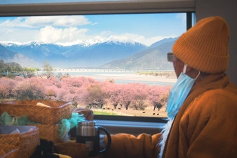 没想到拉林铁路动车上竟然能看到南迦巴瓦峰! 因为南迦巴瓦峰大部分时候云雾缭绕,因此以前经过这里的时候都没看到。 这次在动车经过仲萨巴村附近时,发现远处一片连绵的雪山竟然比近处的山峰还高出了一头,仔细一看这壮美的山形可不就是中国最美雪山么。 尼洋河上的桥梁是林芝市区到米林机场的高速公路。窗内是一位住在巴松措附近的藏族老爷爷,桌上摆满了当地美食!#春游记 #火车看中国 车次:C881 拉萨-林芝 拍摄:A7R4+24-105mm