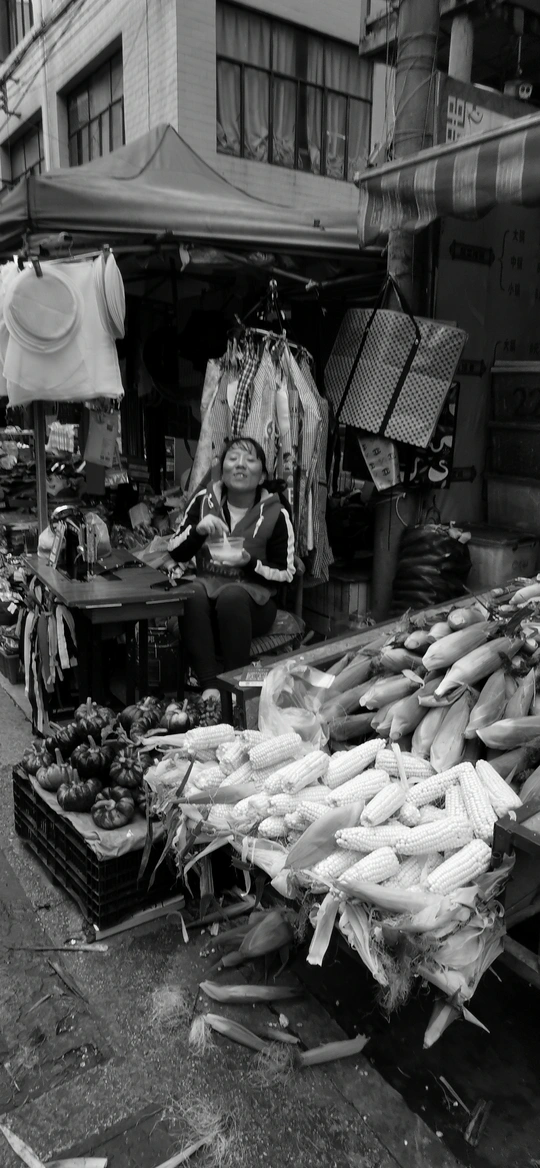 在上马新村集市上见到了一个缝纫摊的主人,她的摊位紧紧地夹在两个卖菜人的摊位之间。此时正是午饭时间,她正趁机吃起了在隔壁不远摊位买来的方便米线还是面条什么的。这是一位乐观的中年女人,她在吃最简单午饭的时候还露出了很自然而朴实的微笑。很显然,她是一个最最普通的劳动者,她为能够靠自己的双手挣钱吃饭并且养活家人而感到满足与幸福。劳动着是光荣的,劳动着是幸福的。