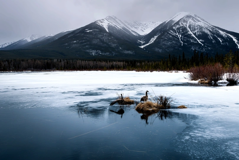 冰湖解冻,大雁飞落,春天来了。
