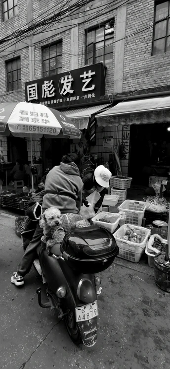 在上马新村集市上你可以看到无数的狗狗,但它们都是陪主人一起来买菜的。而这一条狗狗却有些特别,那它不是被牵着走在地上,而是坐在了电动车的后座上四处招摇。此时它的主人正和熟人什么的在打招呼吹几句散牛,而它自己却自顾自地到处好奇地张望。它长得很帅,也很精神,机灵得让人喜爱,买菜的人们前前后后地靠近了和它打招呼,这集市上的特别景象让人难忘,这是一个非常有生气的集市呢。