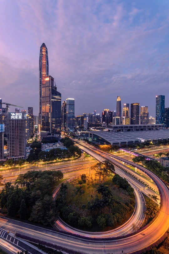 城市里总能看到各种环形路,夜幕落下后利用相机慢门拍出车轨,红色车尾灯在环形路上画出线条,给城市增添一抹动感。