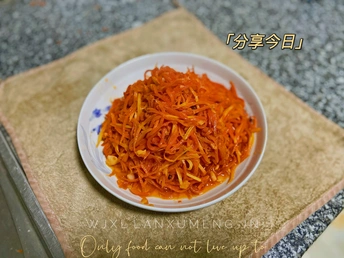 食材萝卜丝 蒜 花椒 做法 胡萝卜切细丝 蒜切碎 花椒几粒 油热把蒜和花椒胡萝丝一起倒入锅中萝卜丝炒软 放点点盐 加点味极鲜和其他生抽 加点鸡精 翻炒均匀 起锅