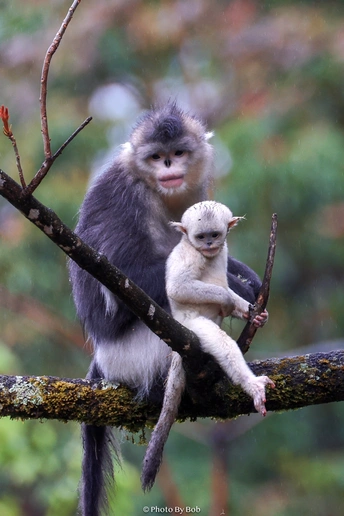 雨天的滇金丝猴国家公园格外阴冷,树杈上一只母猴抱着一只新生的幼猴,格外惹眼。