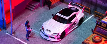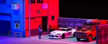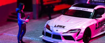 半夜从冰箱拿出一瓶啤酒,溜达到院子里,看看自己的爱车~ 人偶:拓意F20211008喝酒男 车辆:MINIGT 235号 1:64 丰田 Toyota GR Supra 宽体 场景:良本手作02号日式建筑停车场场景