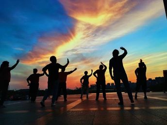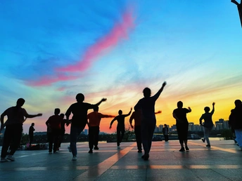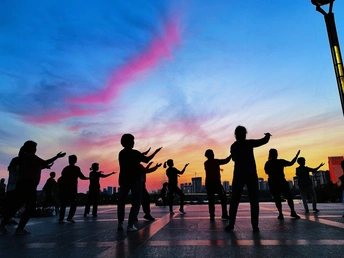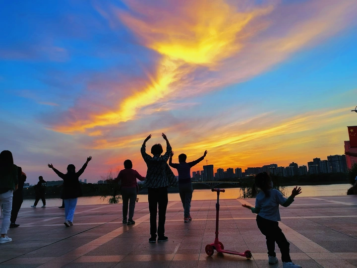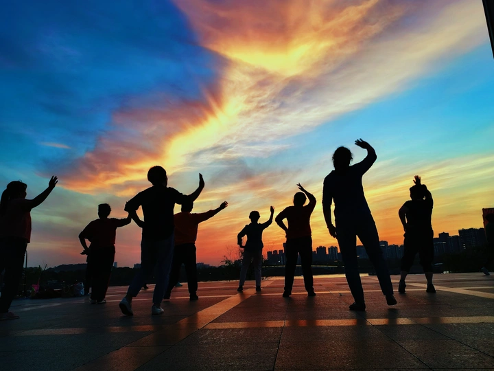 暮光之下,晚霞染晕了天空;似乎是为这群跳广场舞的人精心安排的背景,瑰丽的晚霞,灵动的舞姿,如同一幅美丽的剪影。