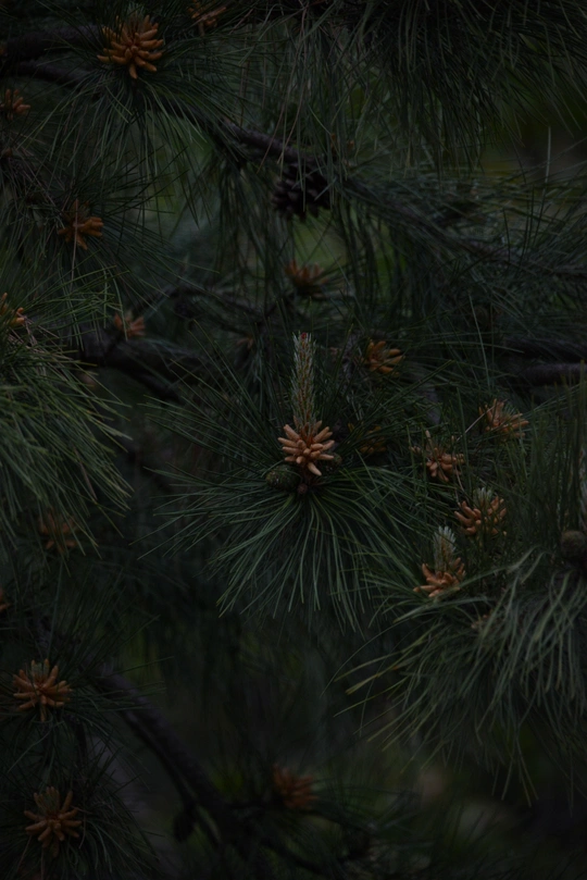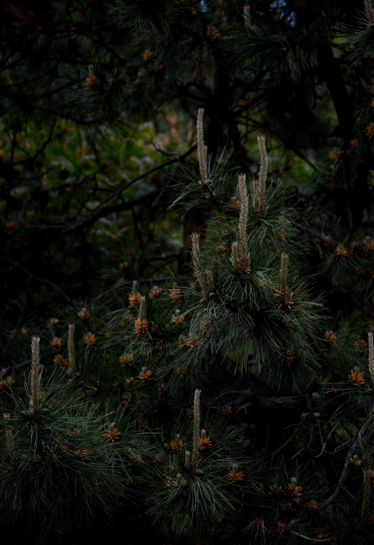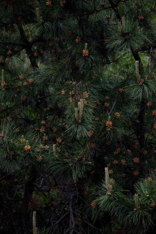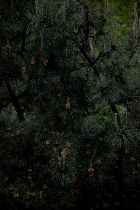 满地松花粉的罪魁祸首。站在朝山侧的房间里看到了屋后的一小片松林,逐举起相机。