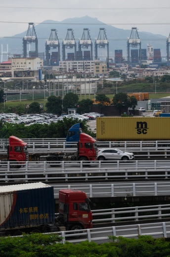 码头附近的高速路,大卡车车来车往,远处的集装箱船舶正在装卸货。