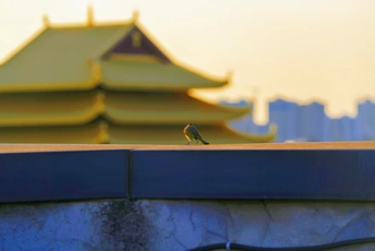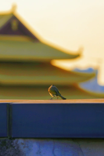 夕阳下,一只麻雀落在天台,望着远处的凤凰岭大桥!