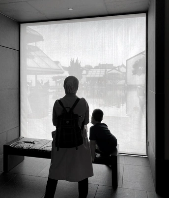 去年3月去参观苏州博物馆,在一个路过走廊休息区看见了这对母子。孩子坐在椅子上,母亲站在孩子身后,一起通过网纱向窗外看去,温馨美好。