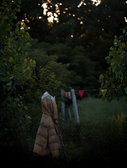 在郊区的林子里探索时看到一个用旧棉袄做的稻草人,感觉很有趣