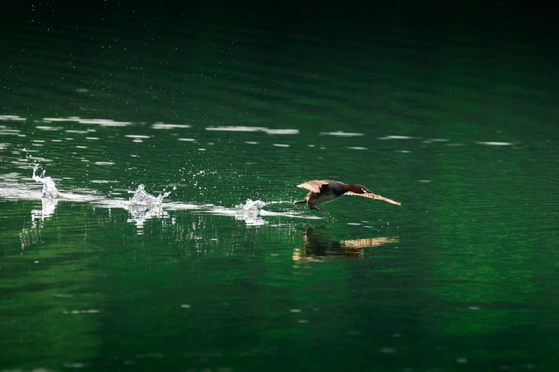 小鸊䴘在各种水域比较常见,活跃于各种湿地和公园之类的神态环境,我在长沙西湖公园的观光步道捕捉了这个瞬间,它尝试着涉水助跑飞起来。这种鸟类飞行力较弱,善于游泳和潜水。