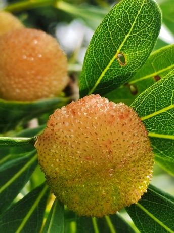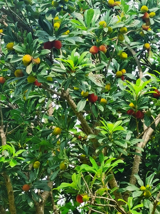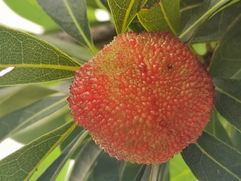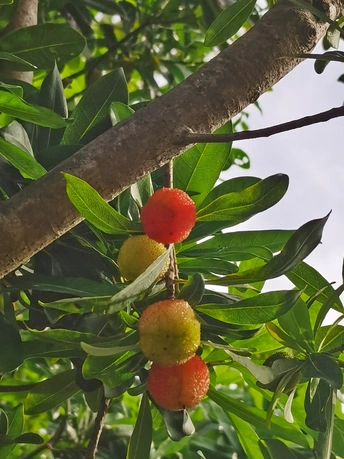 杨梅:属于木兰纲、杨梅科、杨梅属常绿乔木,又称圣生梅、白蒂梅、树梅,具有很高的药用和食用价值,在中国华东和湖南、广东、广西、贵州等地区均有分布。杨梅原产中国浙江余姚,1973年余姚境内发掘新石器时代的河姆渡遗址时发现杨梅属花粉,说明在7000多年以前该地区就有杨梅生长。杨梅属有50多个种,中国已知的有杨梅、毛杨梅、青杨梅和矮杨梅等,经济栽培主要是杨梅。 杨梅枝繁叶茂,树冠圆整,初夏又有红果累累,十分可爱,是园林绿化结合生产的优良树种。孤植、丛植于草坪、庭院,或列植于路边都很合适;若采用密植方式来分隔空间或起遮蔽作用也很理想。经济用途果味酸甜适中,既可直接食用,又可加工成杨梅干、酱、蜜饯等,还可酿酒,有止渴、生津、助消化等功能。