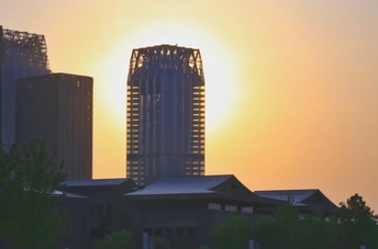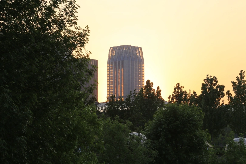 北运河西岸未完工商务楼。 临近初夏,夕阳透射在这座未完工的商务楼上,楼体透射的光芒仿佛在宣告其所蕴含的力量。
