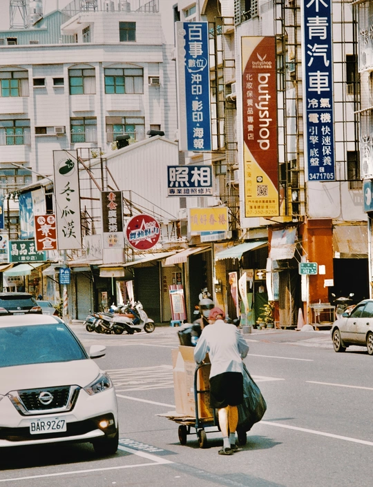 高雄的温度在三月就抵达了30度 我在公交站口等人超过了20分钟 正在喋喋不休地和朋友打字抱怨 我看到一个推垃圾车的老人 缓缓地向前走着 他走路的速度很慢 慢到我有时间拿出底片相机调焦距 耳旁全是飞驰而过摩托车的轰轰声 … 地点:中国台湾·高雄 时间:2022/3/21