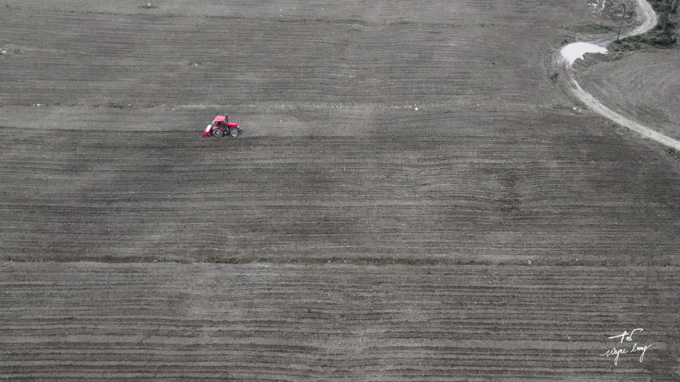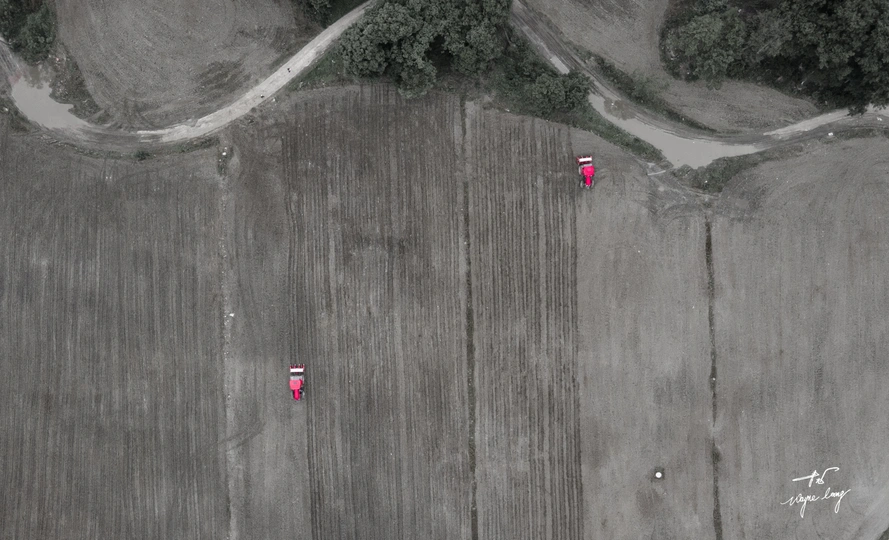 在去打卡成都绿道蜀道通衢的附近,偶然间航拍到在收割小麦后田里耕作的两台大红,于是按下快门,低饱和度下却是充满希望。