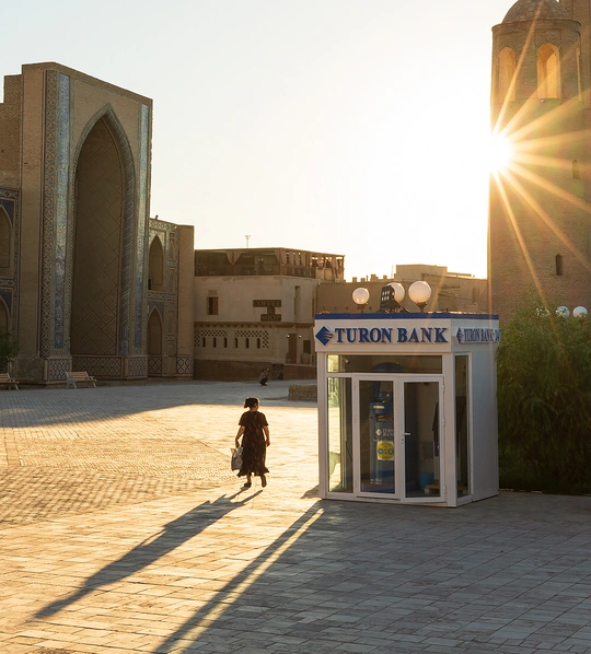 初夏时节,清晨五点多,朝阳初升,古城的人们还沉浸在梦乡中。独自行走的保洁大妈在古城广场上投下长长的影子。 天上无云,晴空万里,这是布哈拉初夏的清晨。